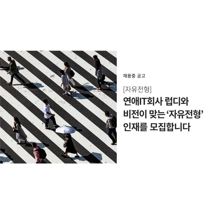 ☁️ 자유 전형 자유도, 성과, 연애로 말하는 연애 IT회사 '럽디' 럽디와 함께 세상에 사랑의 가치를 전달할 마케터를 모집합니다. 저희는 더 나은 서비스를 제공하기 위해 고객이 어떻게 생각하는지를 데이터화하여 끊임없이 관찰합니다. 사랑과 연관된 서비스/모바일 앱을 개발하여, 월 평균 21%씩 성장하고 있습니다. 이런 분과 함께하길 원해요 실패를 두려워하지 않고 많은 테스트를 즐기시는 분 수평적인 업무 문화를 바탕으로 자유로운 생각 표현과 의사 결정을 추구하시는 분 누가 시키지 않아도 스스로 일을 하며 책임지는 분 타 직군과 적극적으로 교류하며 협업하실 분 사랑으로 세상을 바꿀 혁신의 가치를 아시는 분 💡 우리는 롤드리븐형 인재를 선호해요. https://brunch.co.kr/@svillustrated..